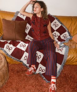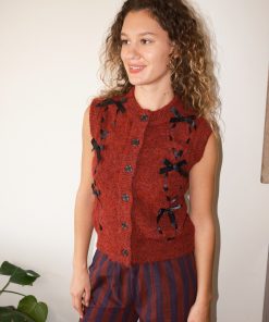 Designed to be worn as a top or layered within a look, The Kimmy vest from Damson Madder features a burgundy cable knit and black ribbon ties.