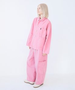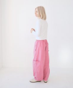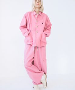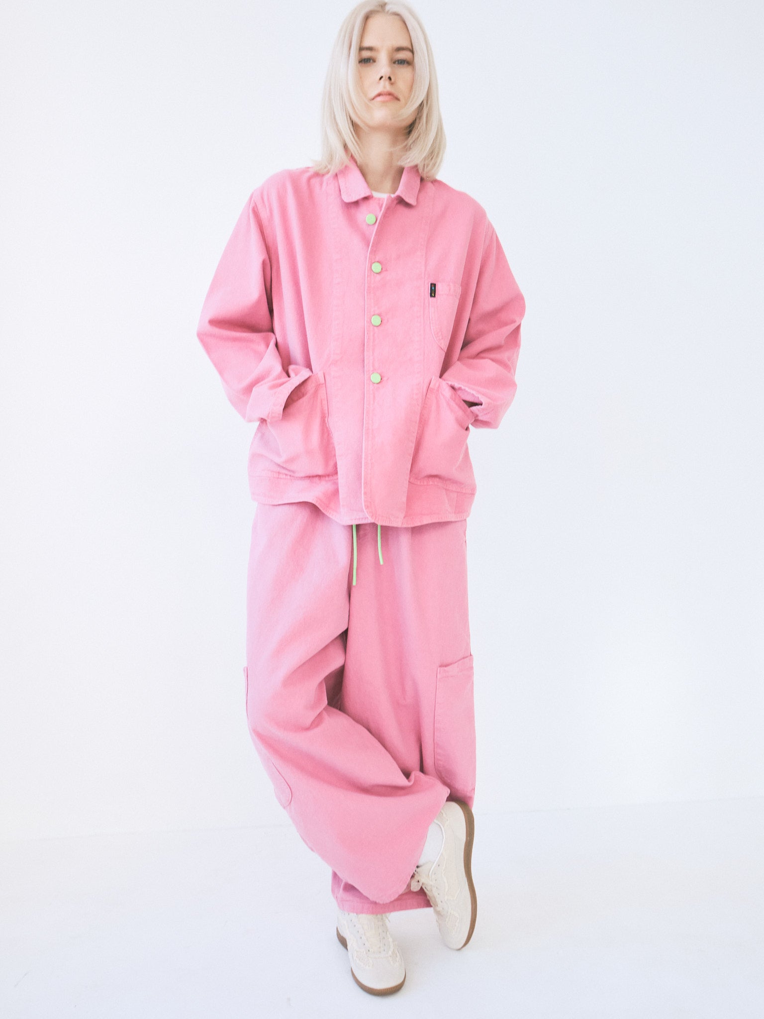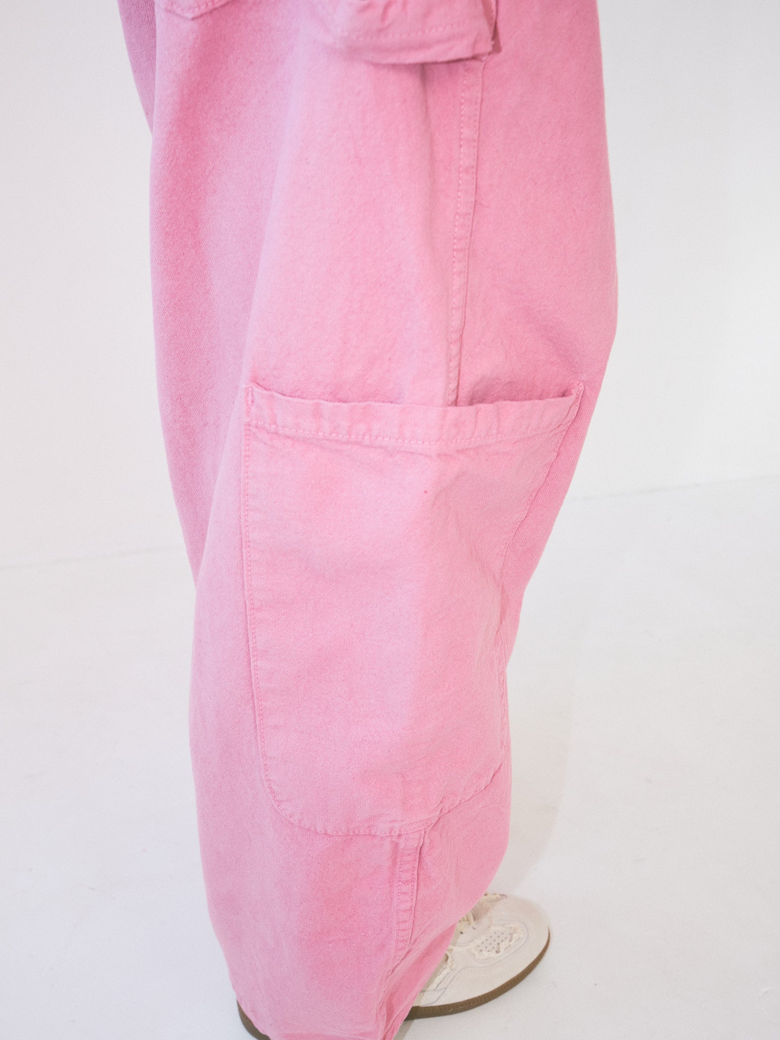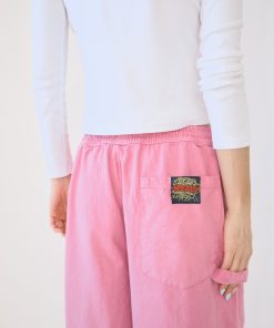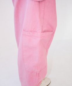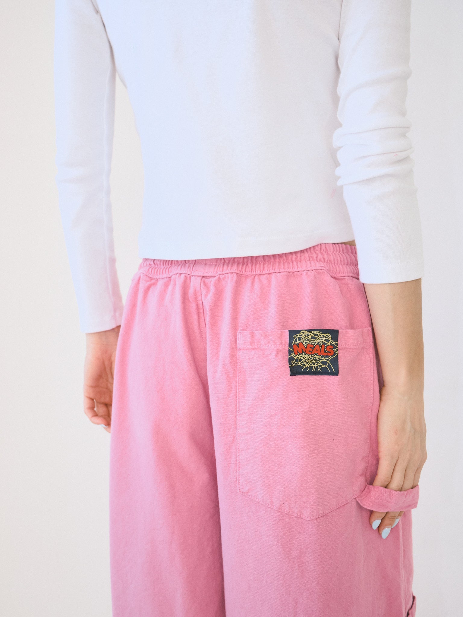 Wide leg baggy pant made out of a 100% cotton canvas featured in a donut box pink color with a neon green drawstring at the waist for a versatile fit. Features plenty of large pockets.