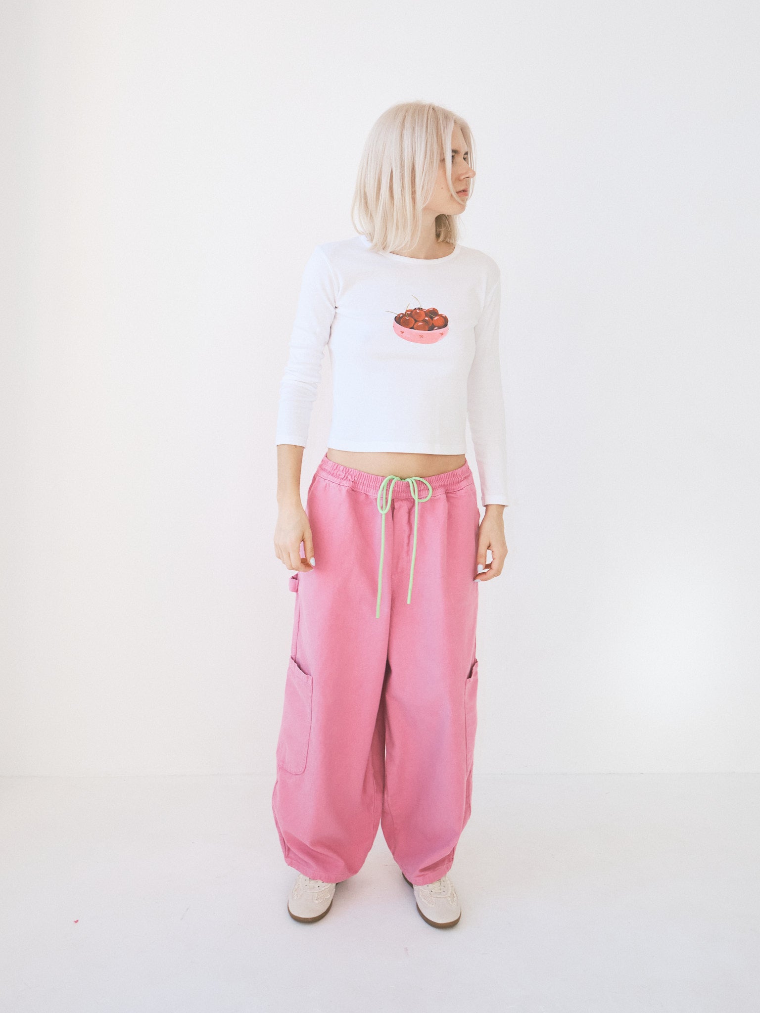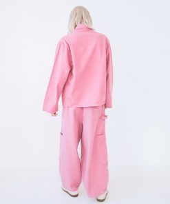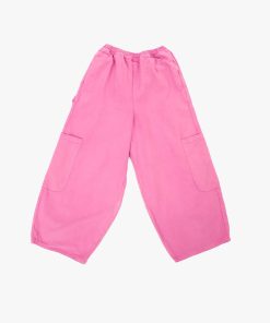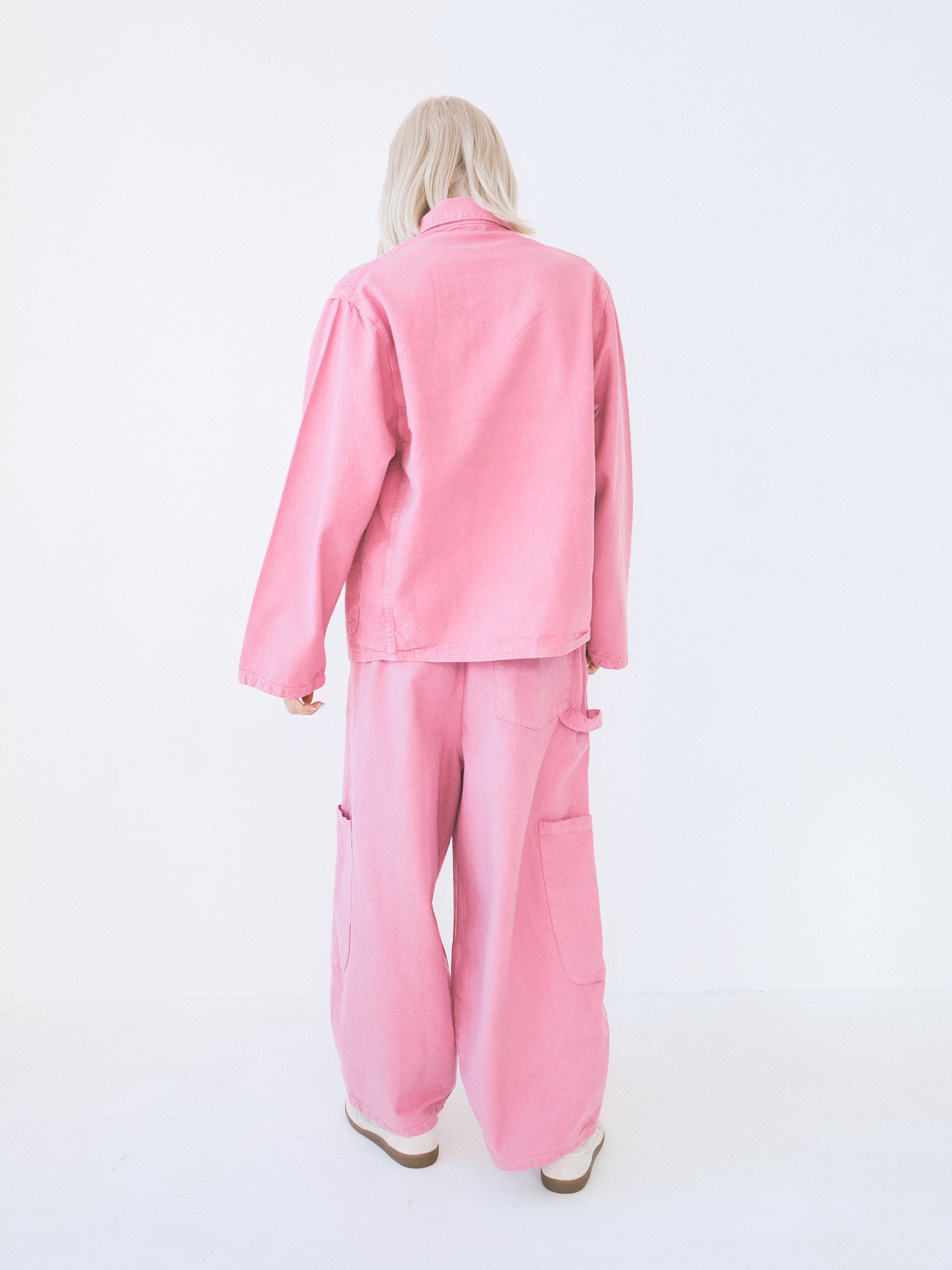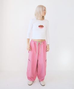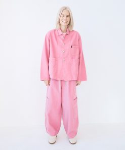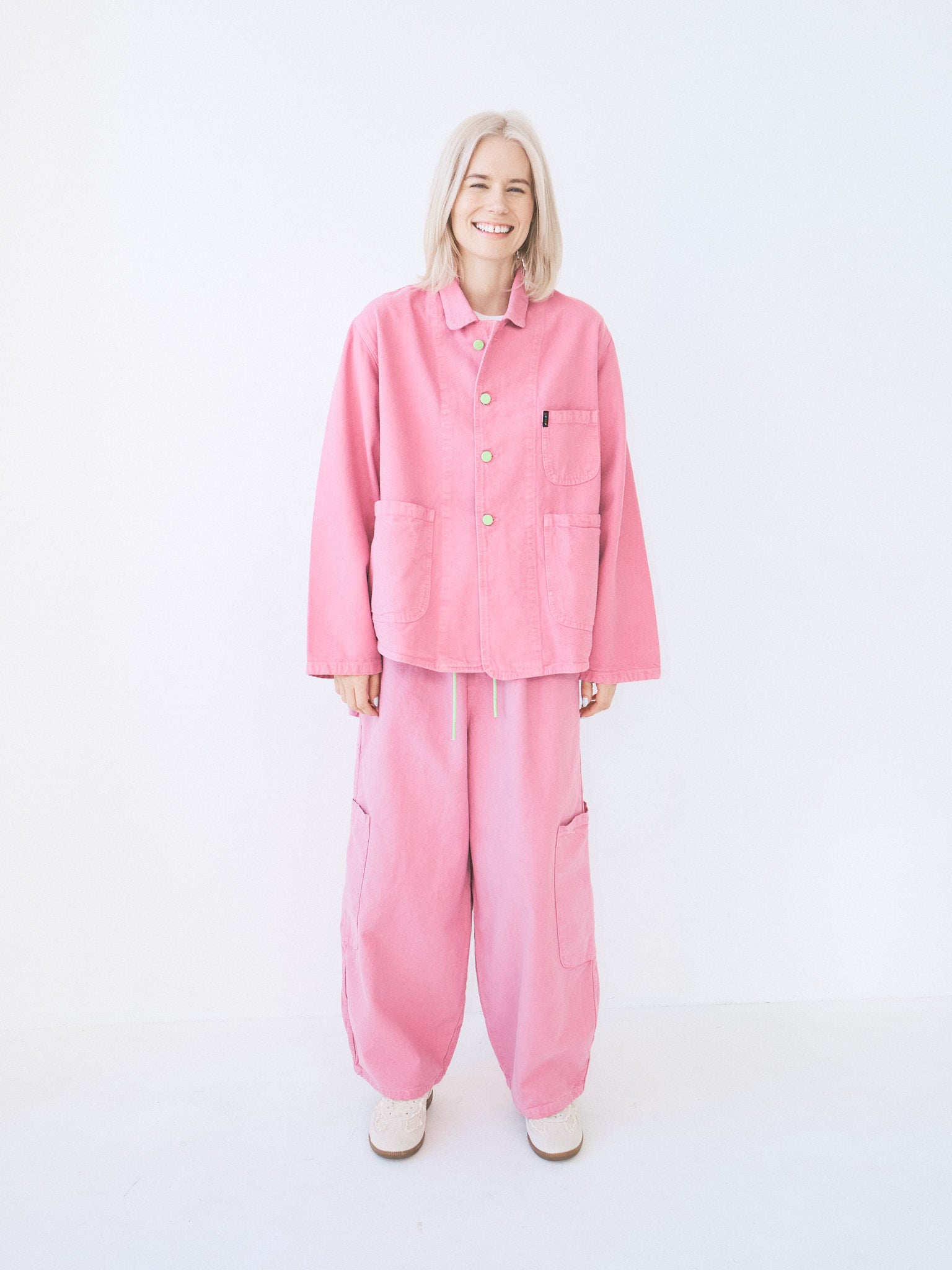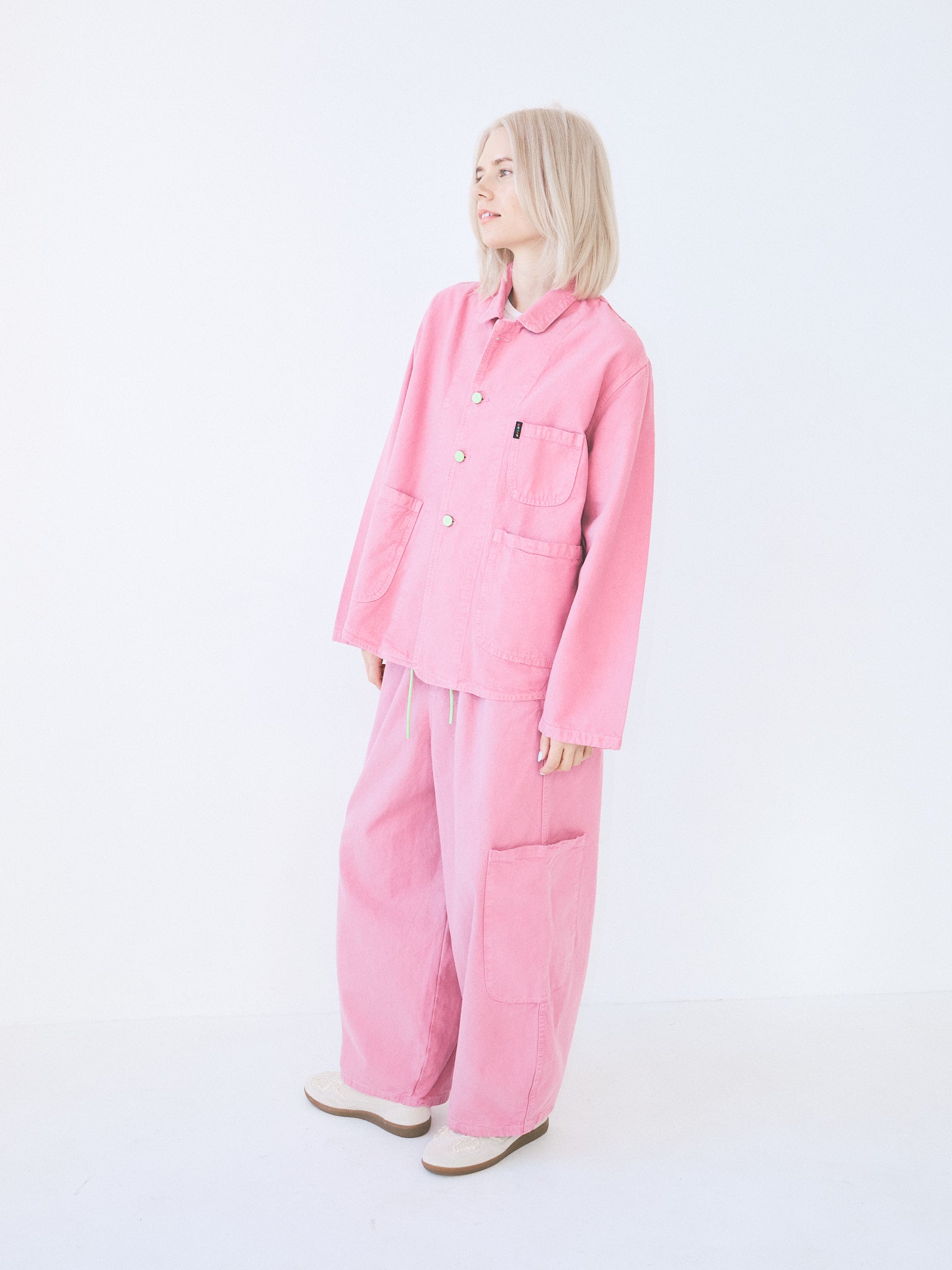 Wide leg baggy pant made out of a 100% cotton canvas featured in a donut box pink color with a neon green drawstring at the waist for a versatile fit. Features plenty of large pockets.