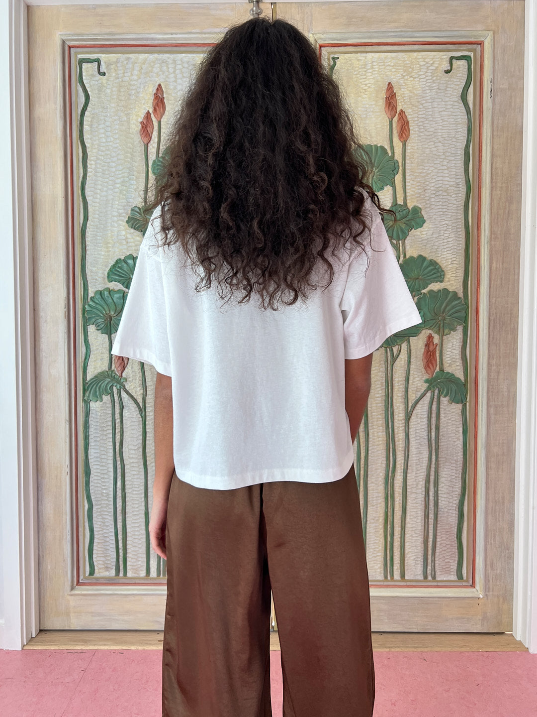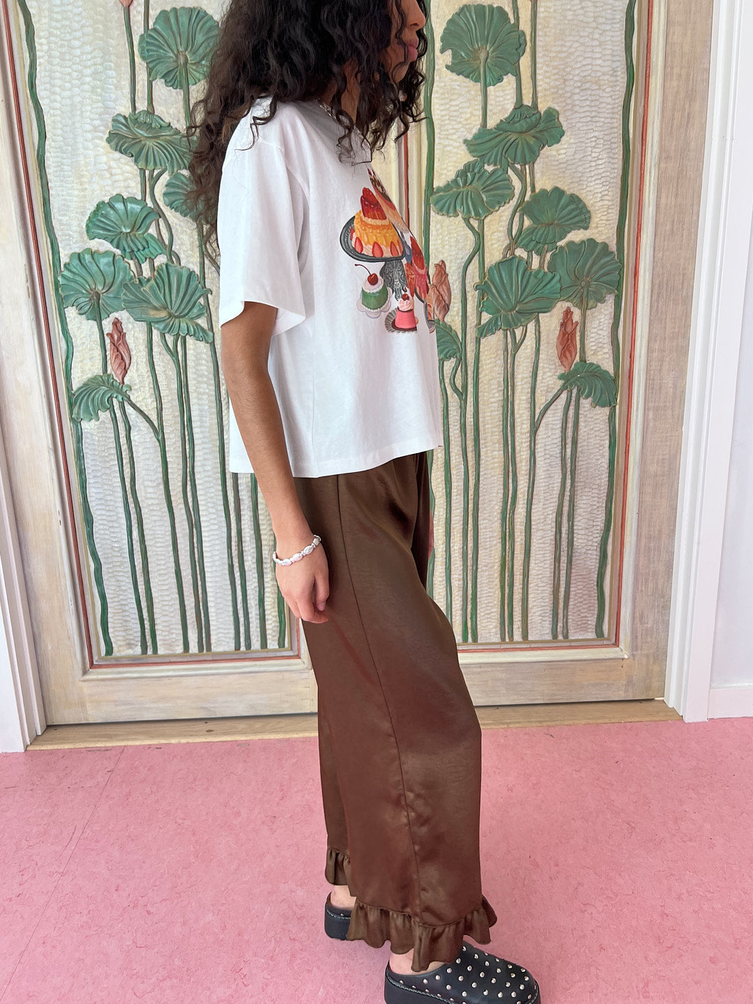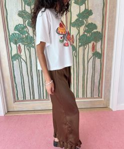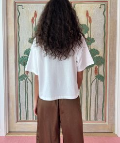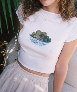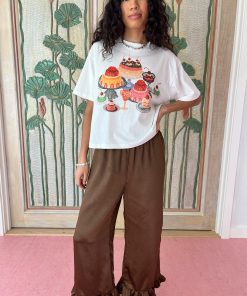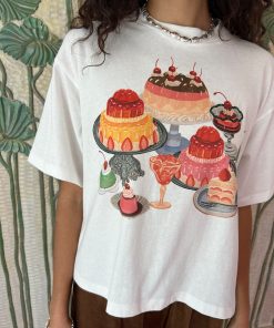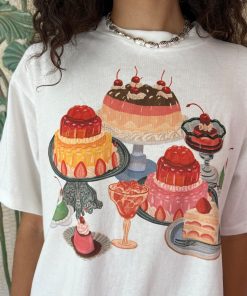 Classic unisex white tee with a slightly cropped boxy fit, drop shoulder, and a thick rib collar in a lightweight cotton jersey with a fun dessert graphic.
