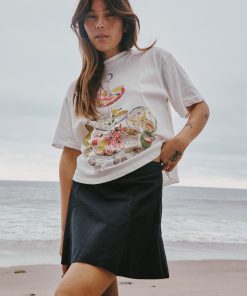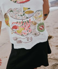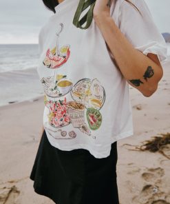 Classic unisex white tee with a slightly cropped boxy fit, drop shoulder, and a thick rib collar in a lightweight cotton jersey with a fun oyster tower graphic.