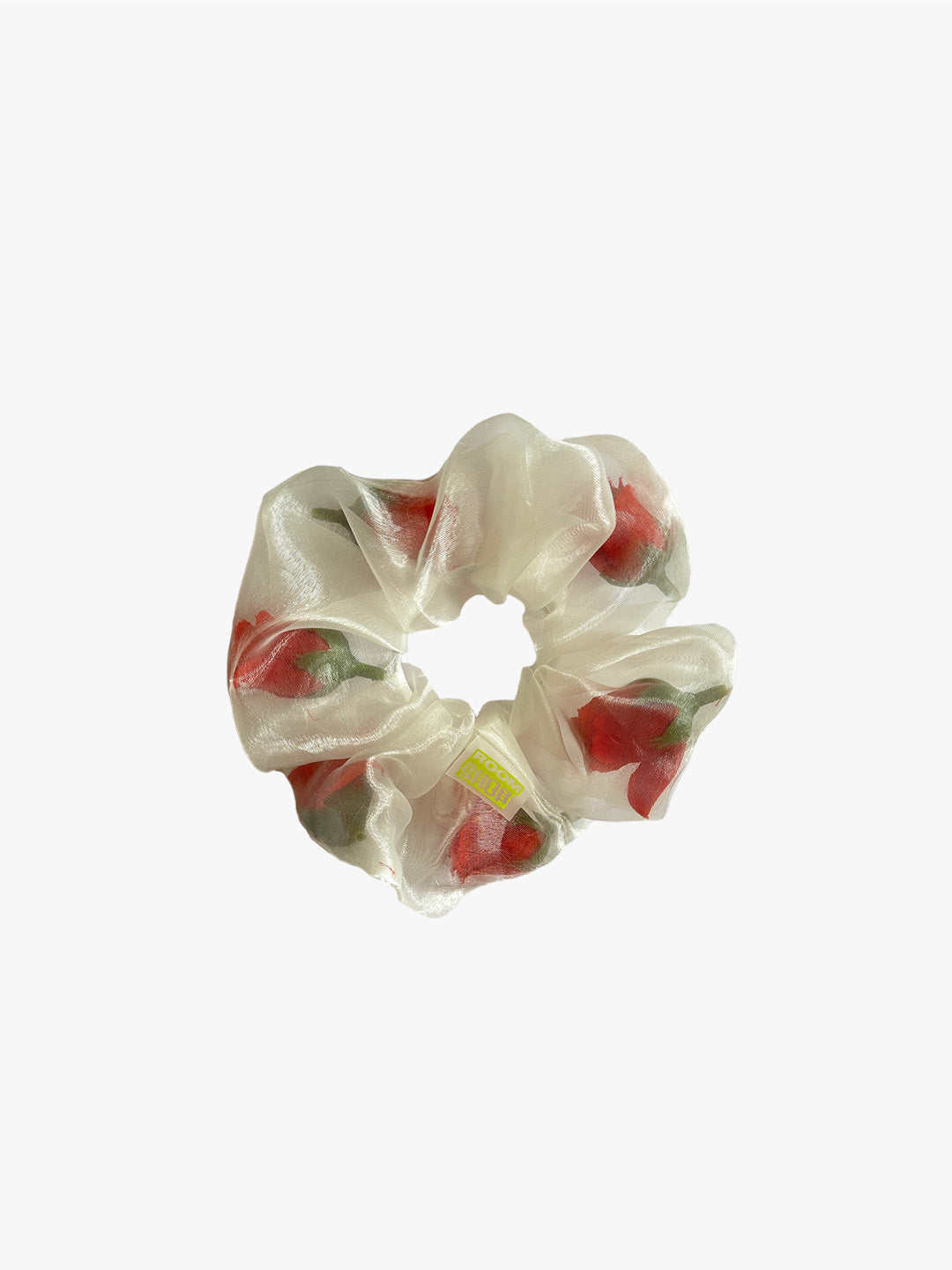 A sheer organza scrunchie filled with red silk roses. 6″ in diameter, this scrunchie is fun and delicate.
