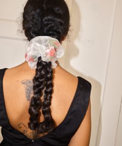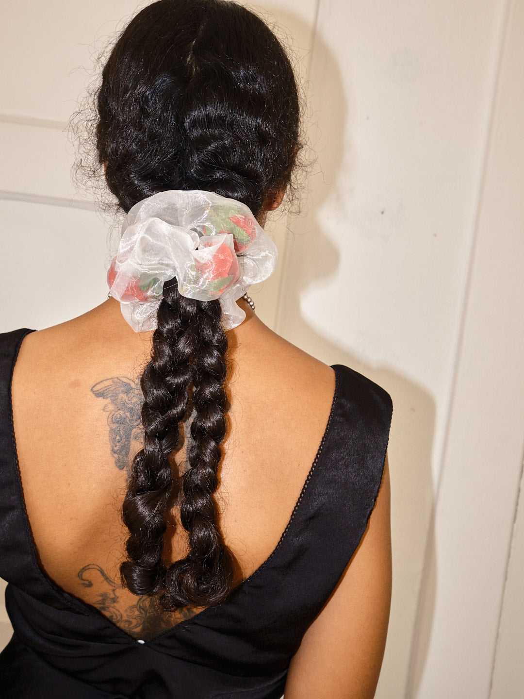 Room Shop’s sheer organza scrunchie filled with faux flowers encapsulated inside.Each piece is one of a kind and will vary slightly.