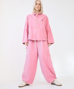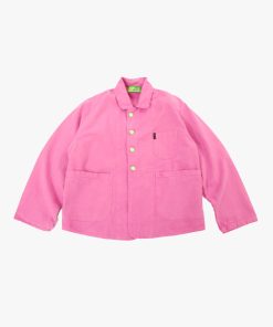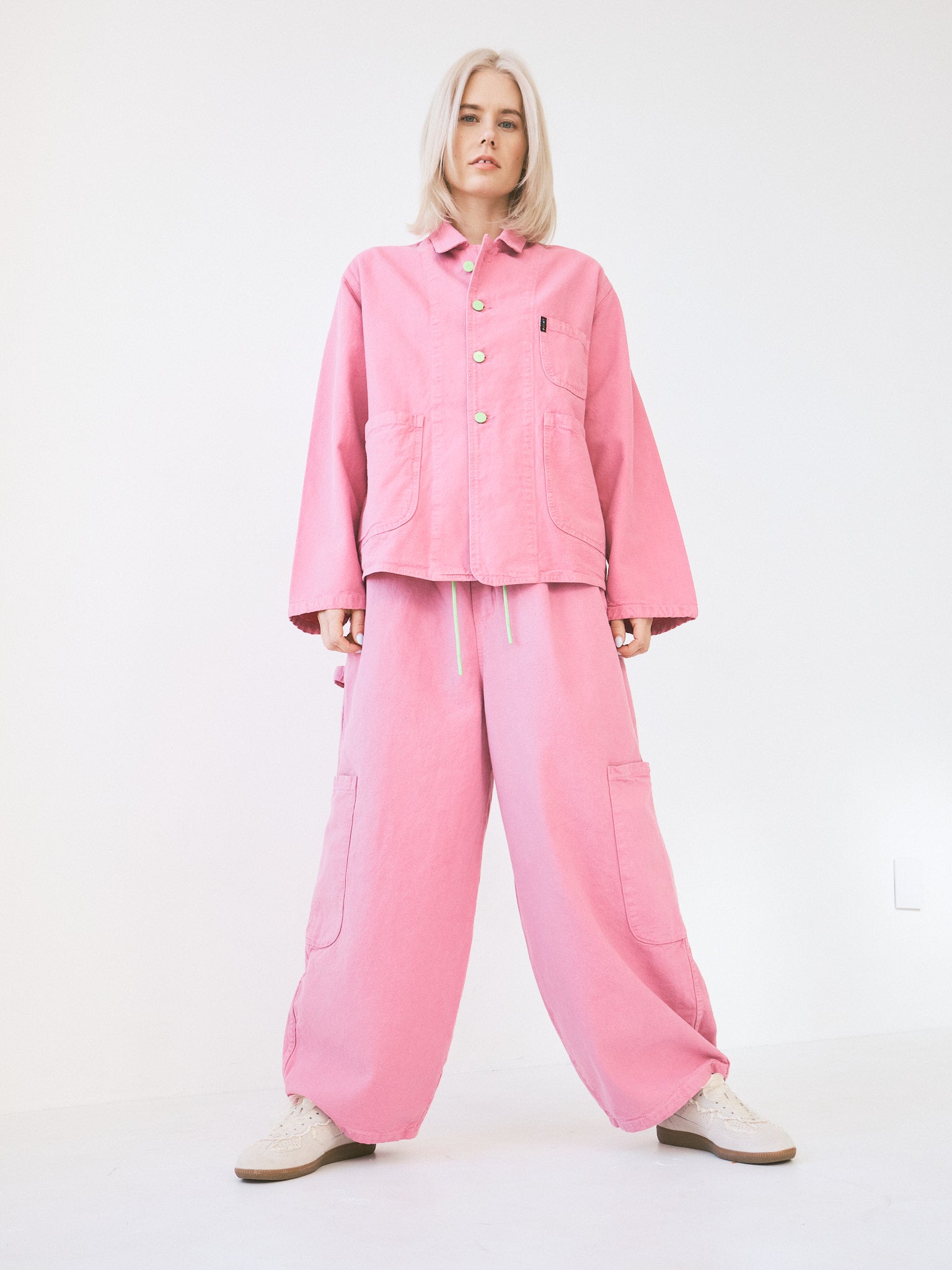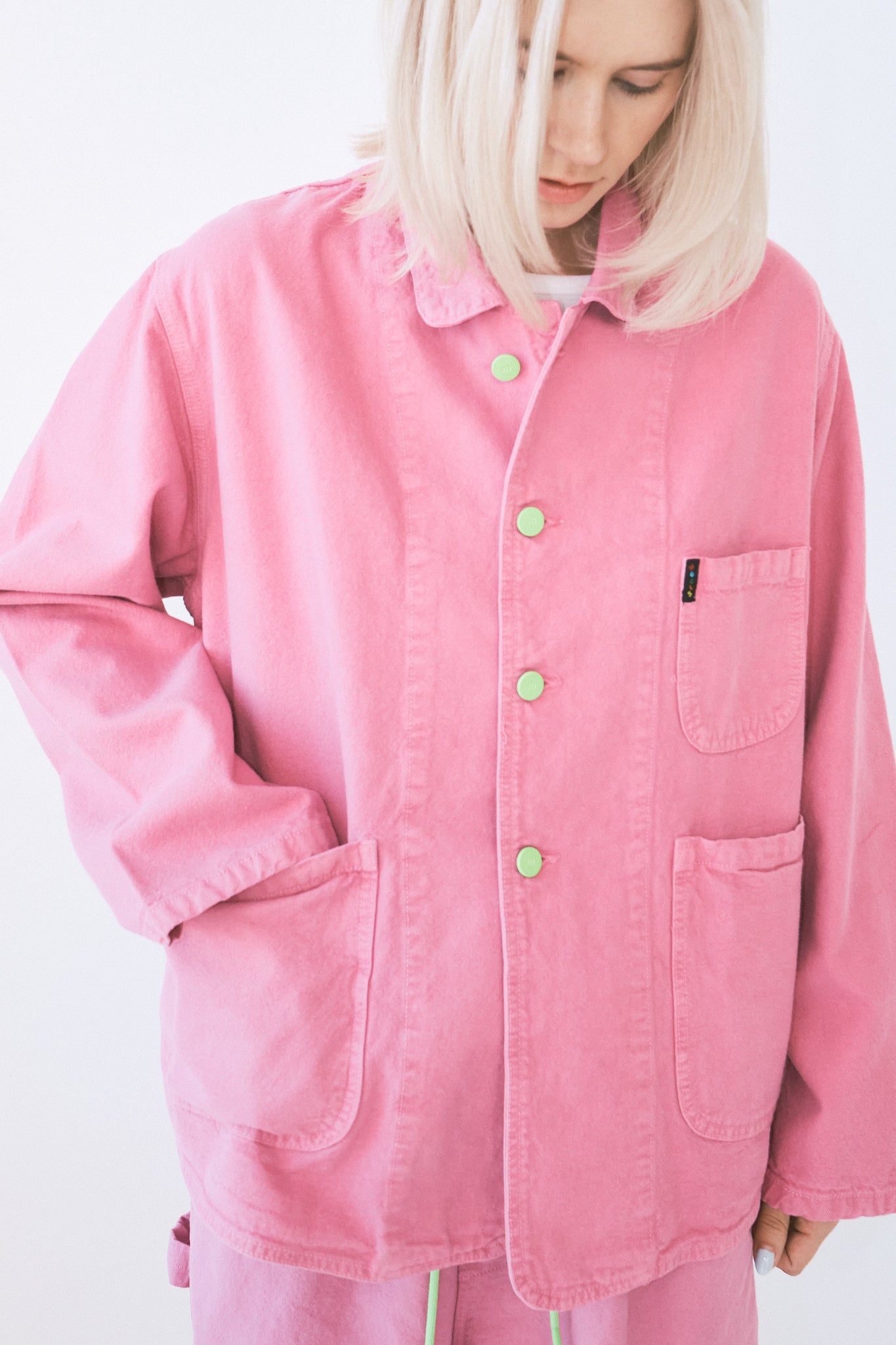Boxy chore jacket made in a 100% cotton, pink dyed canvas. Designed and manufactured in Los Angeles and features neon green buttons and plenty of pockets for versatile wearing.