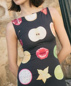 Mini dress with a high boat neckline, featured in a fun fruit slice print. Soft and stretchy for a comfortable fit. Please note that this dress may run slightly small. Customers recommend a size up.