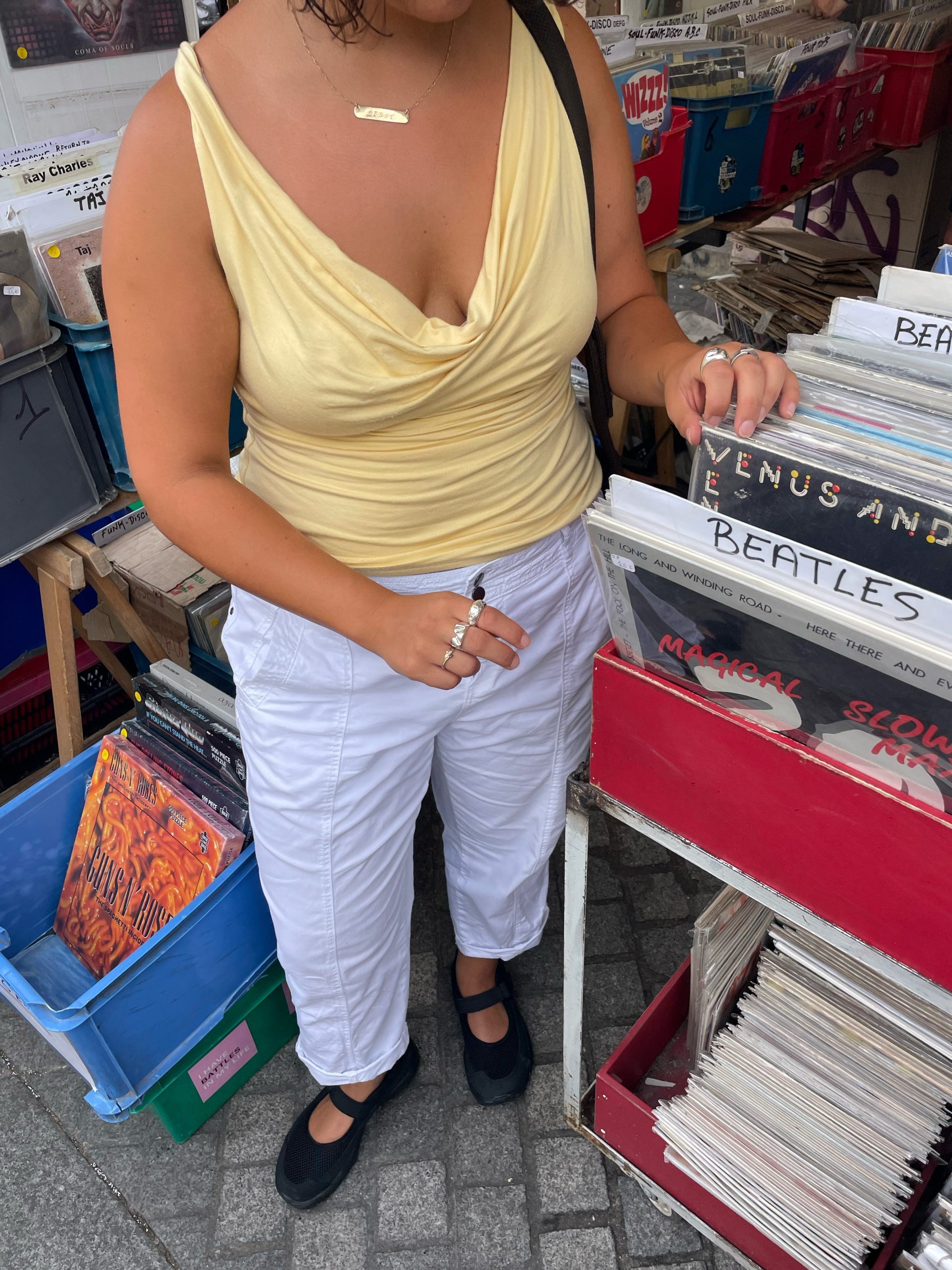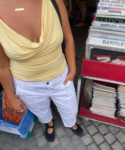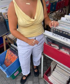 Knit top with a cowl neckline featured in a butter yellow. This top cinches at the waist for a fitted look. This stretchy knit fabric is comfortable and accounts for about 2-3in of stretch all around.