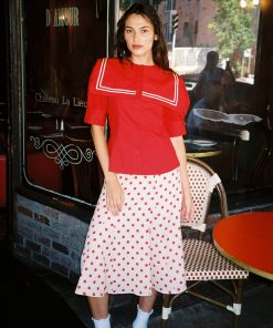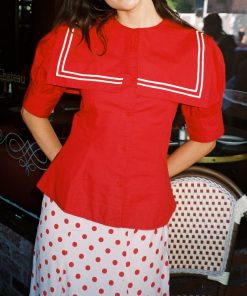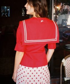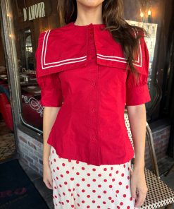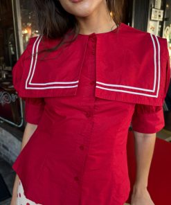 Introducing the Keisha Blouse in Cherry Red from Damson Madder—a playful pop of color for any outfit! This top features an oversized sailor collar and a classic button-down front, balanced by a fitted waist for a flattering shape. Crafted from 100% organic cotton with a short bubble sleeve. True to size—select your usual fit..