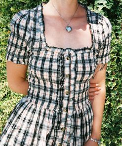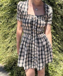 Mini dress with full button front featuring a square neckline and a shirred bodice for ultimate comfort. This dress is made of 100% cotton in a fun butter check print.