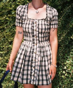 Mini dress with full button front featuring a square neckline and a shirred bodice for ultimate comfort. This dress is made of 100% cotton in a fun butter check print.