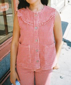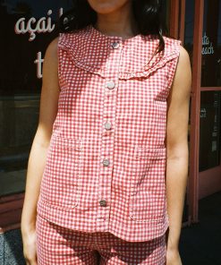 Maintaining a clean, streamlined silhouette, elevated by Damson Madder’s custom red gingham print and ruffle detailing, the Mari gilet is a chic summer staple.