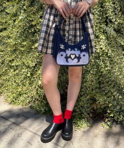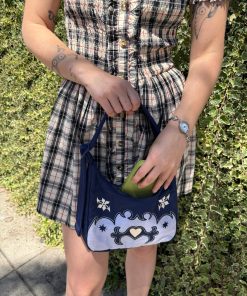 Nylon shoulder bag zip closure and adjustable quilted strap with a fun western design at the front.
