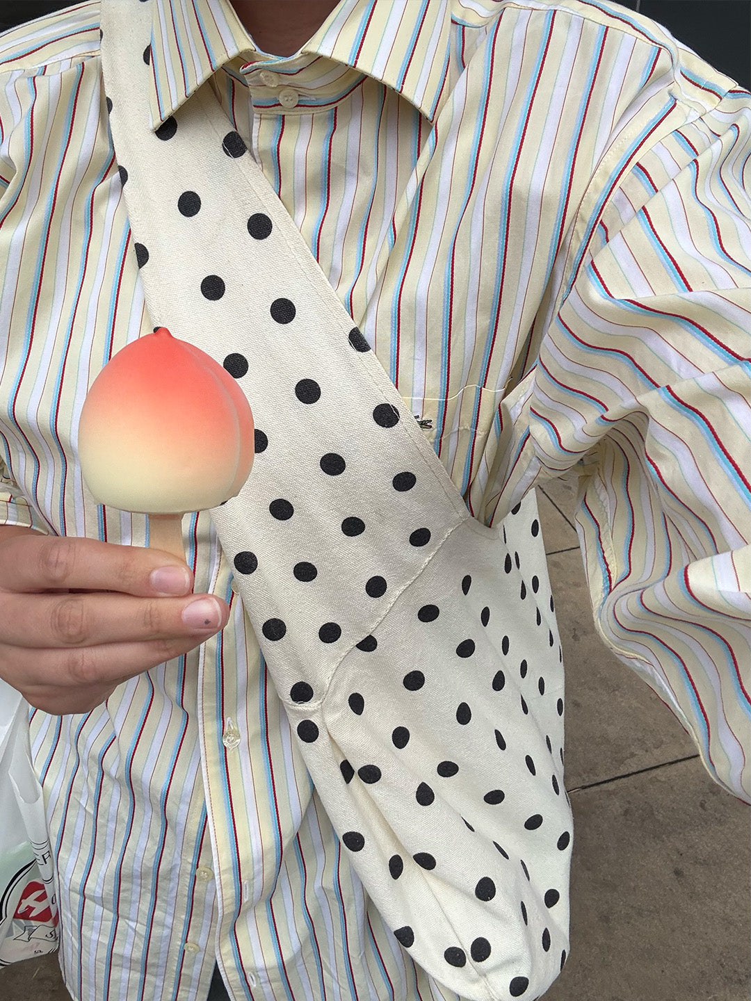 Canvas slouchy tote bag with a black and white polka dot print. This canvas tote is open and does not have a closure. Can be worn cross body or over the shoulder.
