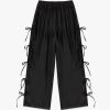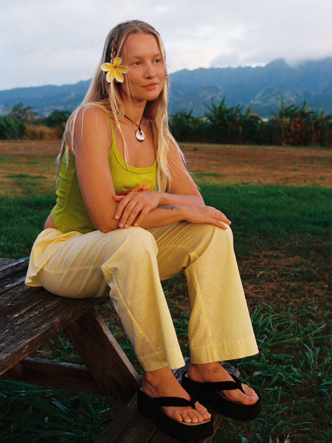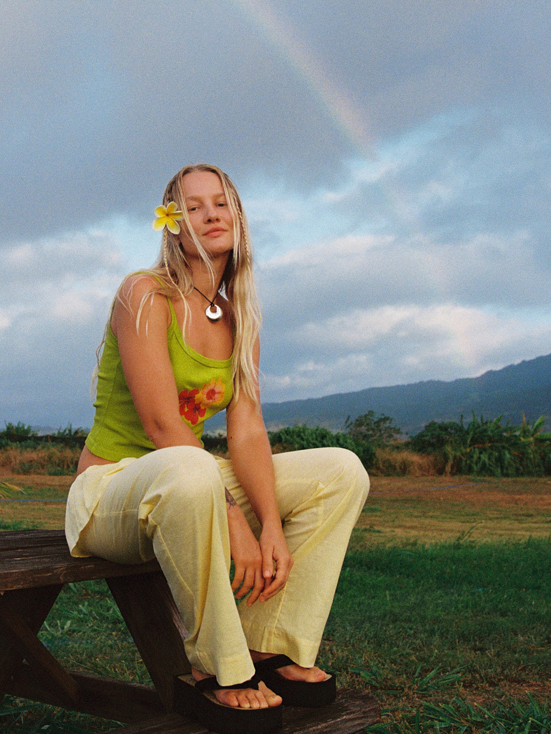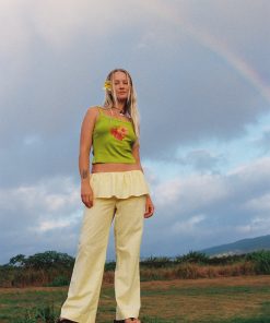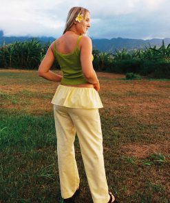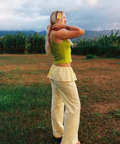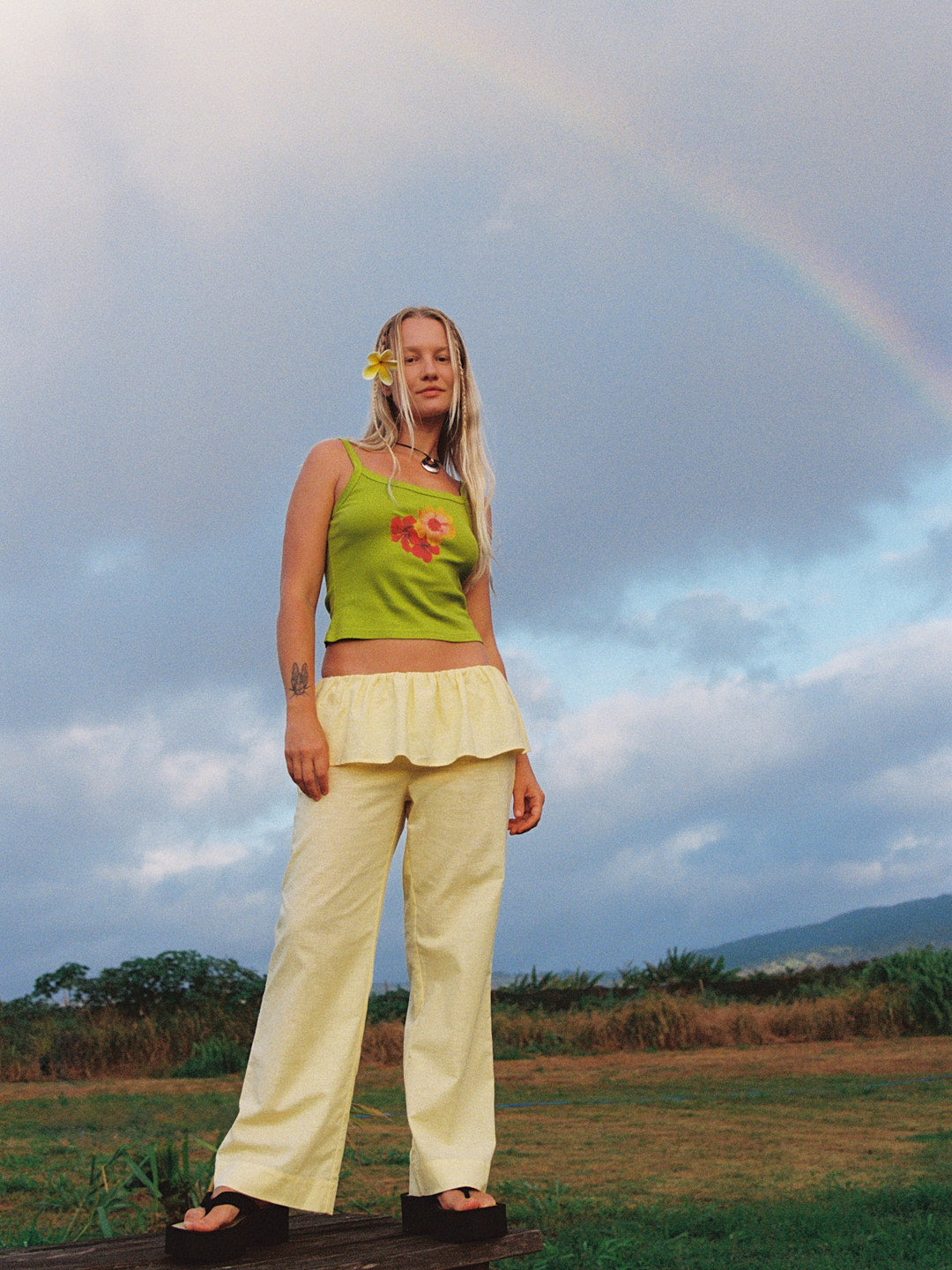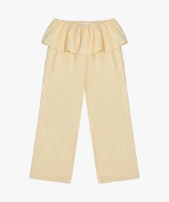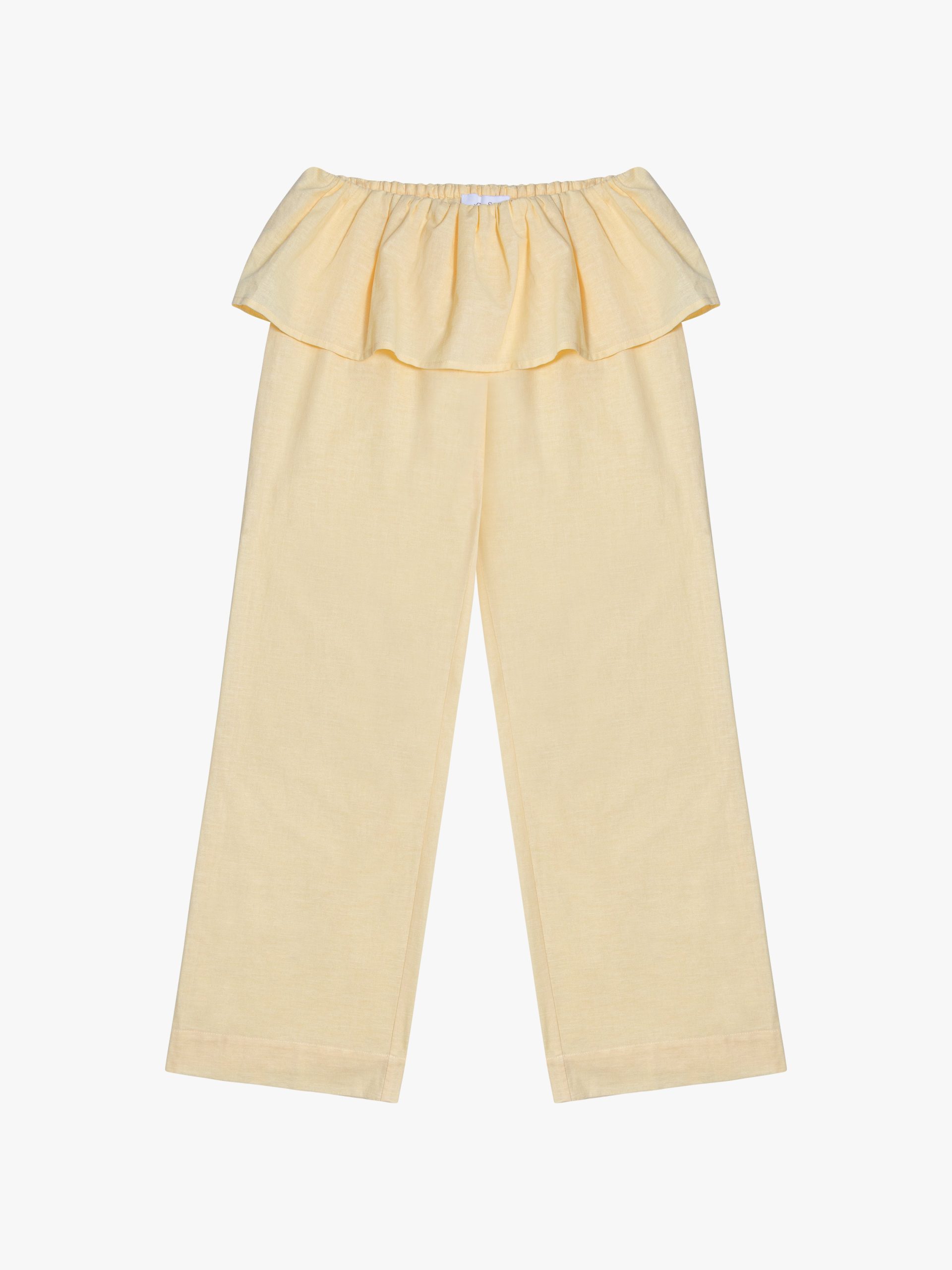 Straight leg linen blend pants with tiered ruffle skirt attachment at top featured in a perfect butter yellow color.