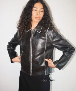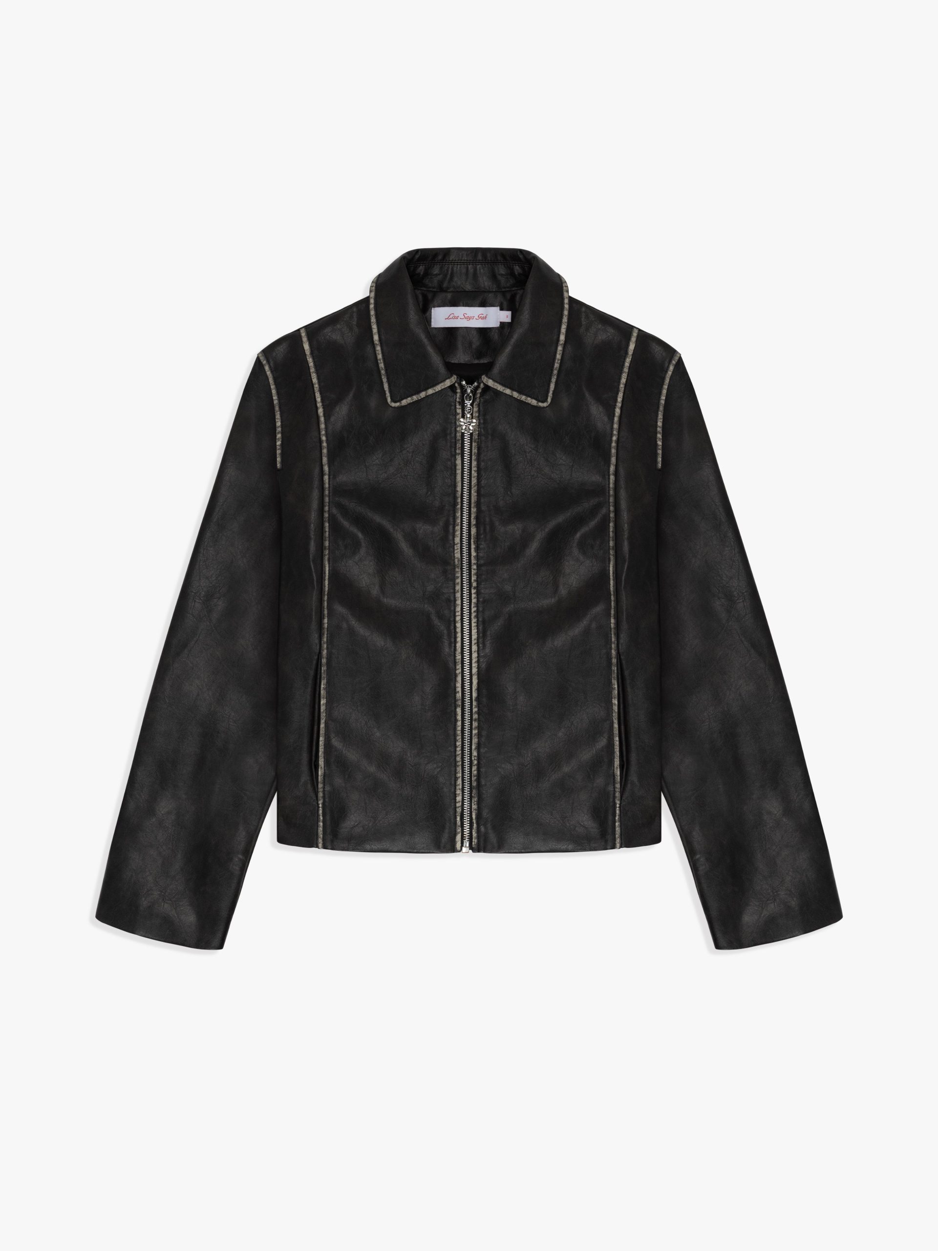 Faux leather fitted jacket with a zip closure and side-seam pockets. Featured in a vintage-inspired distressed fabric.