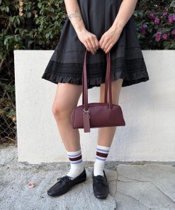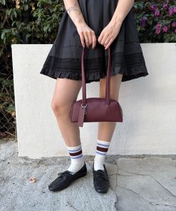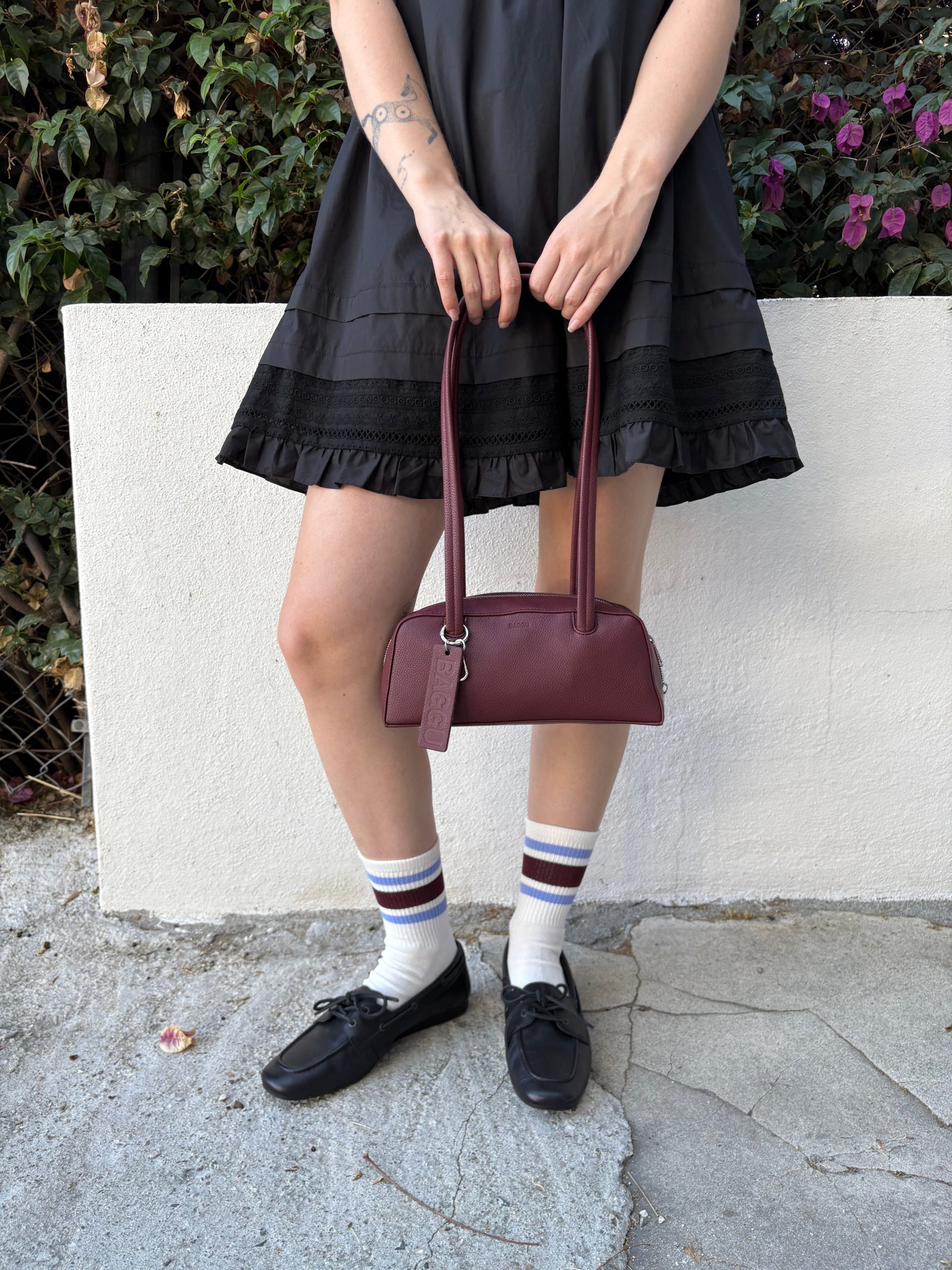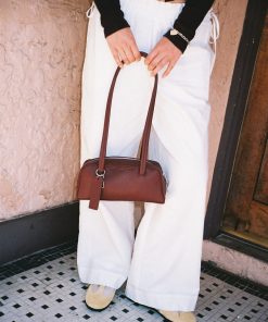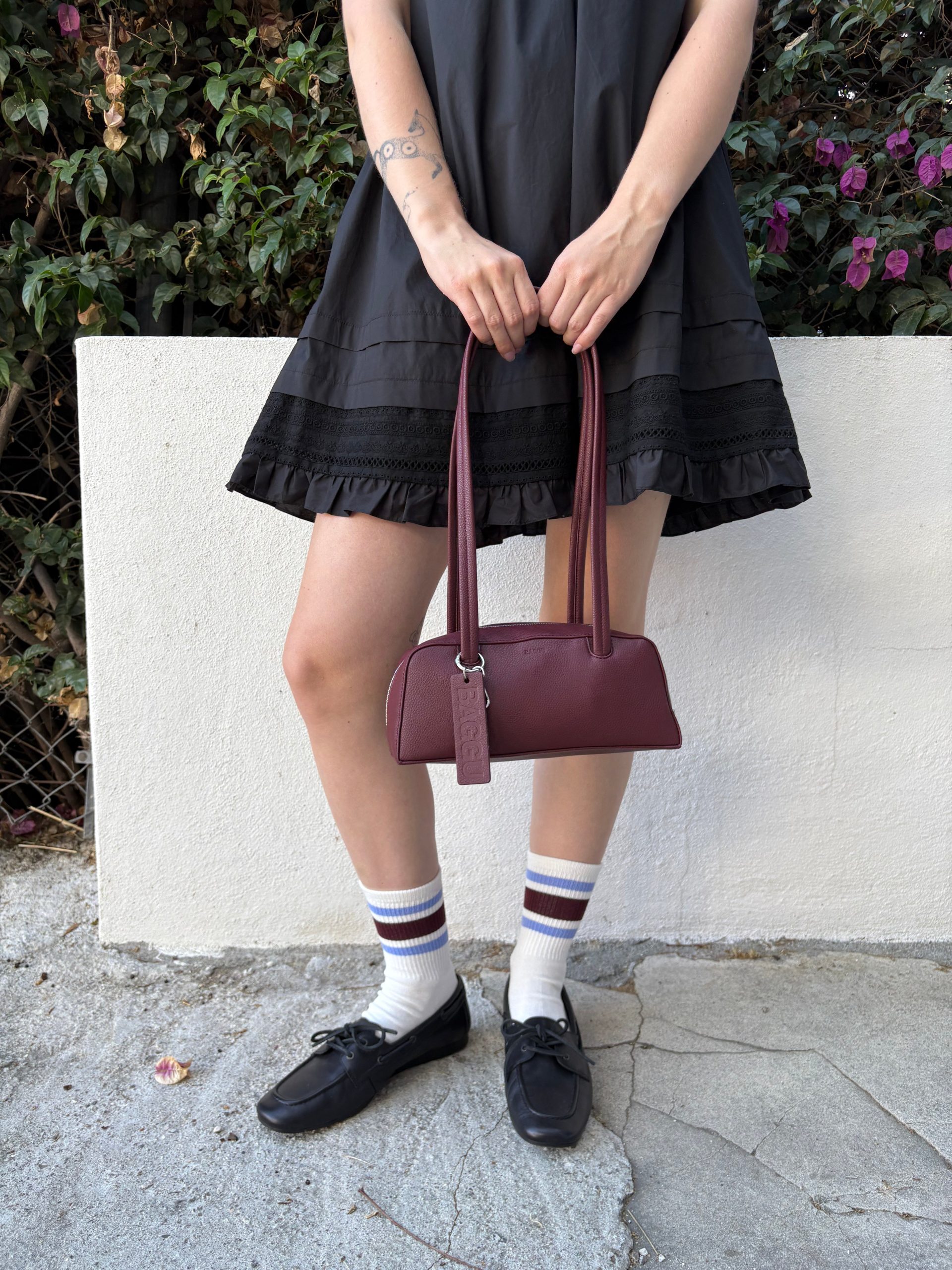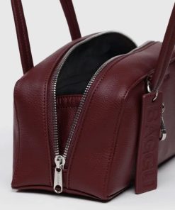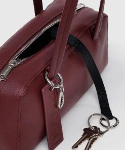 Recycled leather bowler bag from Baggu featured in a Mahogany color with an internal black logo key leash, metal carabiner, an interior zip pocket, strap.