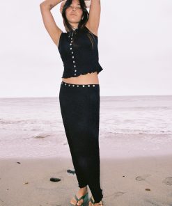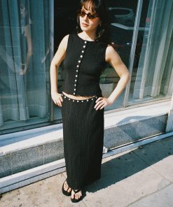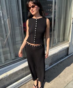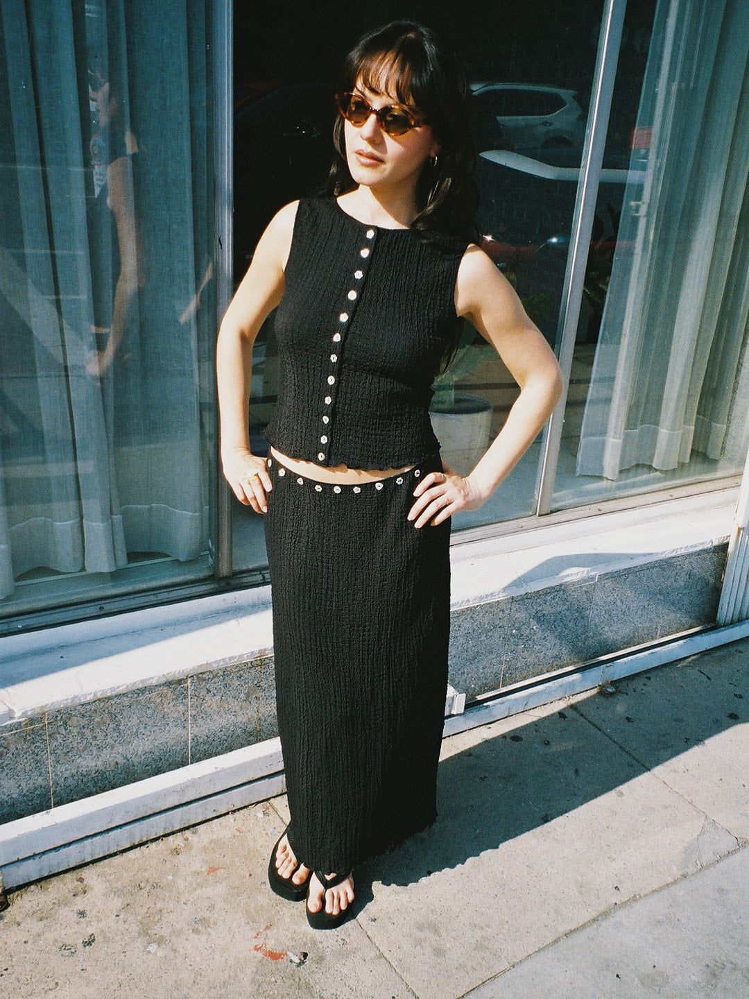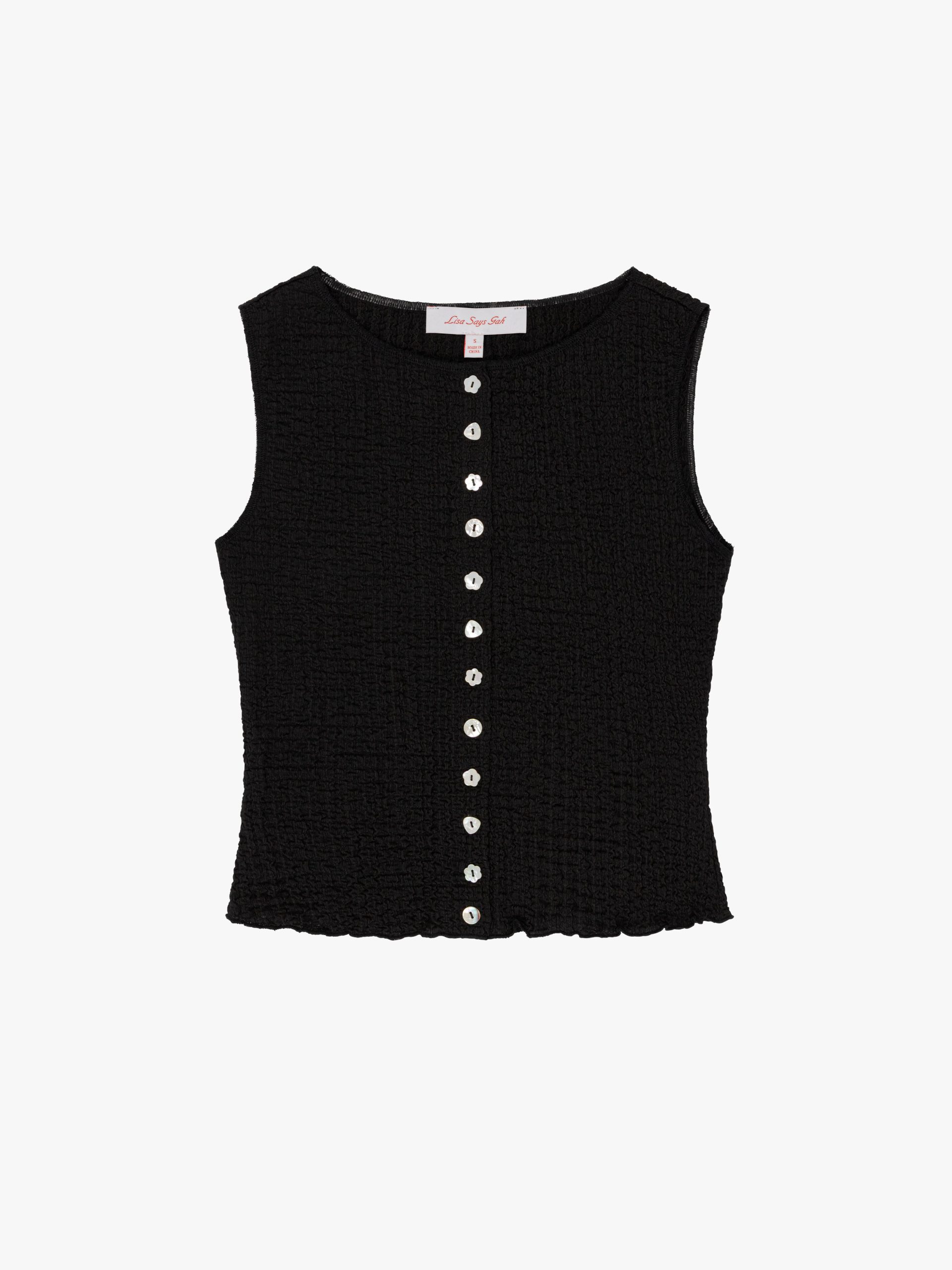 This is a sleeveless, black top made with a crinkle knit fabric. It has a round neckline and shell buttons down the front. The hem is slightly ruffled, and the fit is stretchy and snug. We recommend sizing up if you are between sizes.