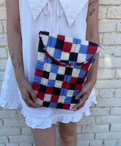Puffy laptop sleeve with a velcro closure, featuring a playful check print, quilted with padding for extra protection.